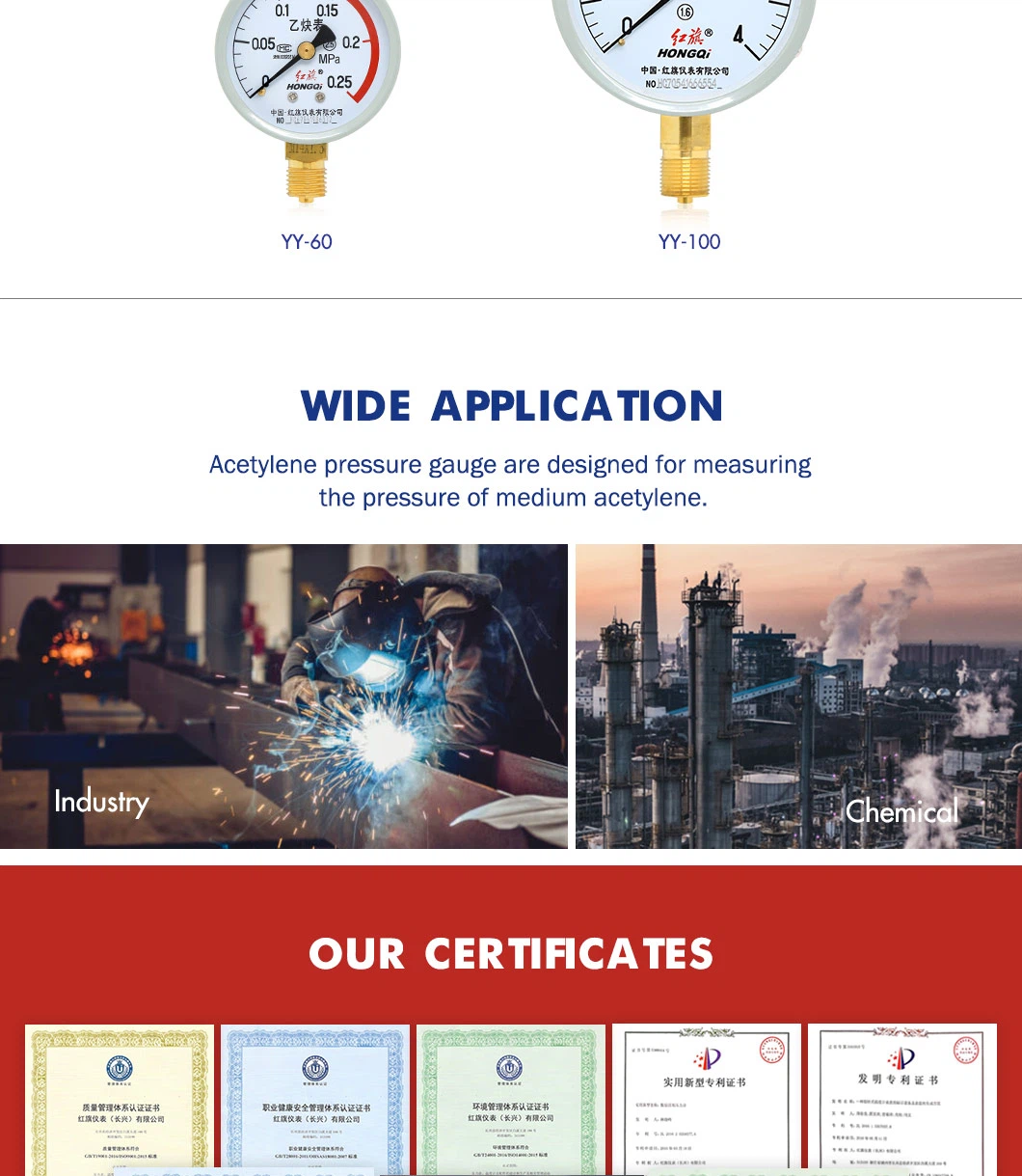 우리의 평판 대가를 치러야 할 수확이 있어야 합니다. 압력계의 국가검증과 규제에 참여하는 유일한 기업입니다. 국가 기압계 표준 위원회 회원 단위, 국가 기압계 협회 부회장 단위, 중국 측량 학회 선진 단위, Zhejang 계약 지향 및 신뢰할 수 있는 단위, Yueqing 문명 기업, 건설 은행에서 수여하는 Zhejiang 신용 등급 AAA 기업 중 하나로 중국의. 온주 성장형 중소기업, 게다가 5년 연속 품질 관리 선진 단위 및 계약 지향 및 신뢰할 수 있는 단위로 선정되었으며 제품은 ISO9001: 2000 품질 시스템 인증을 통과했습니다. 2016년에 Honggi의 상표는 Zhejiang Province의 공상 관리국에 의해 Zhejiang Province의 유명한 상표로 승인되었습니다.